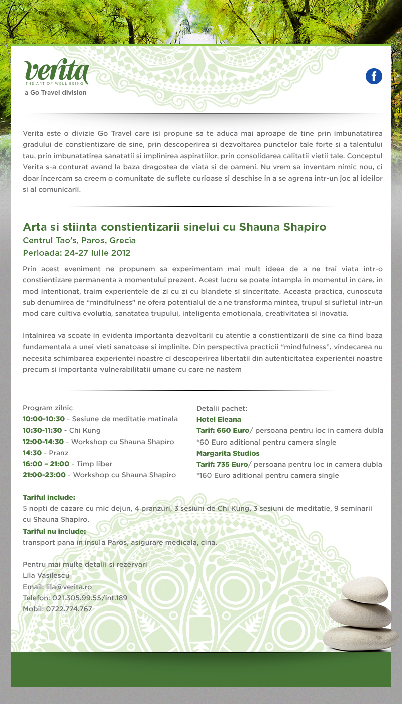 Intre 24 - 27 iulie 2012 la Centrul Tao s Paros din Grecia, va avea loc un "mindfulness retreat" sub indrumarea instructorului Shauna Saphiro. |